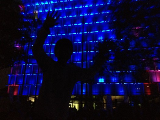 On Saturday night for the PIAF festival opening the sky was snowing feathers. Below people sat on the warm bitumen of the closed off main city street. They took over the city. The cars were gone. A French troupe, Les Studios de Cirque, soared from the blue and pink glowing council chambers to Saint George’s cathedral. From sky scraper to sky scraper they sped, super-hero style, trawling white silk. Then others, dressed all in white, slowly trundled the wire with suitcases, umbrellas and buckets laden with feathers, emptying them onto the street below. Large clumps, as big as bricks, fell from the sky. But bricks of feathers are just pillows. Sack after sack of feathers came showering down on the crowd below. People stood with arms outstretched reaching for the falling feathers.
