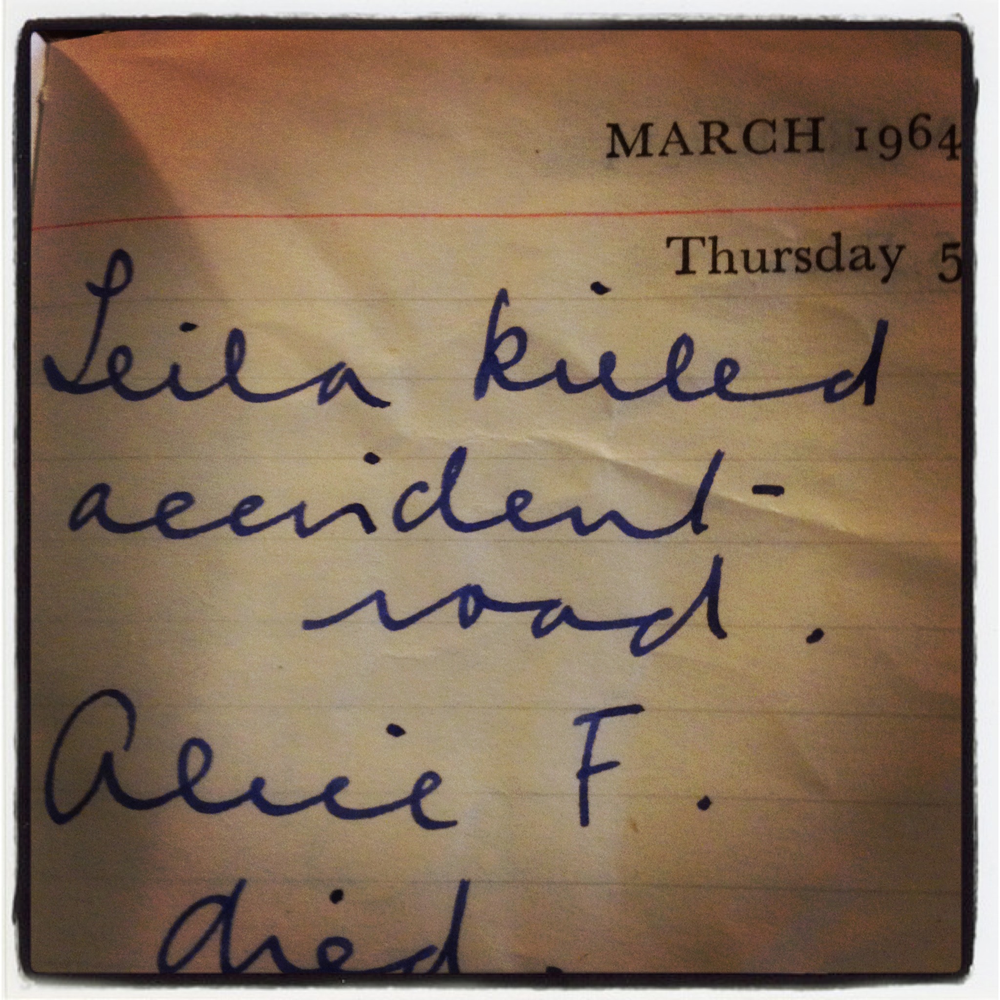 On March 5th 1964 she writes; Leila killed accident-road. Alice F died. Nothing more. I think about my own accident. In a diary somewhere has a sister written; Nicole car accident – paralysed. A mother written; Nicole accident-road – might die. What tears are hidden beneath the blue fountain pen scrawl? Who was Leila?
