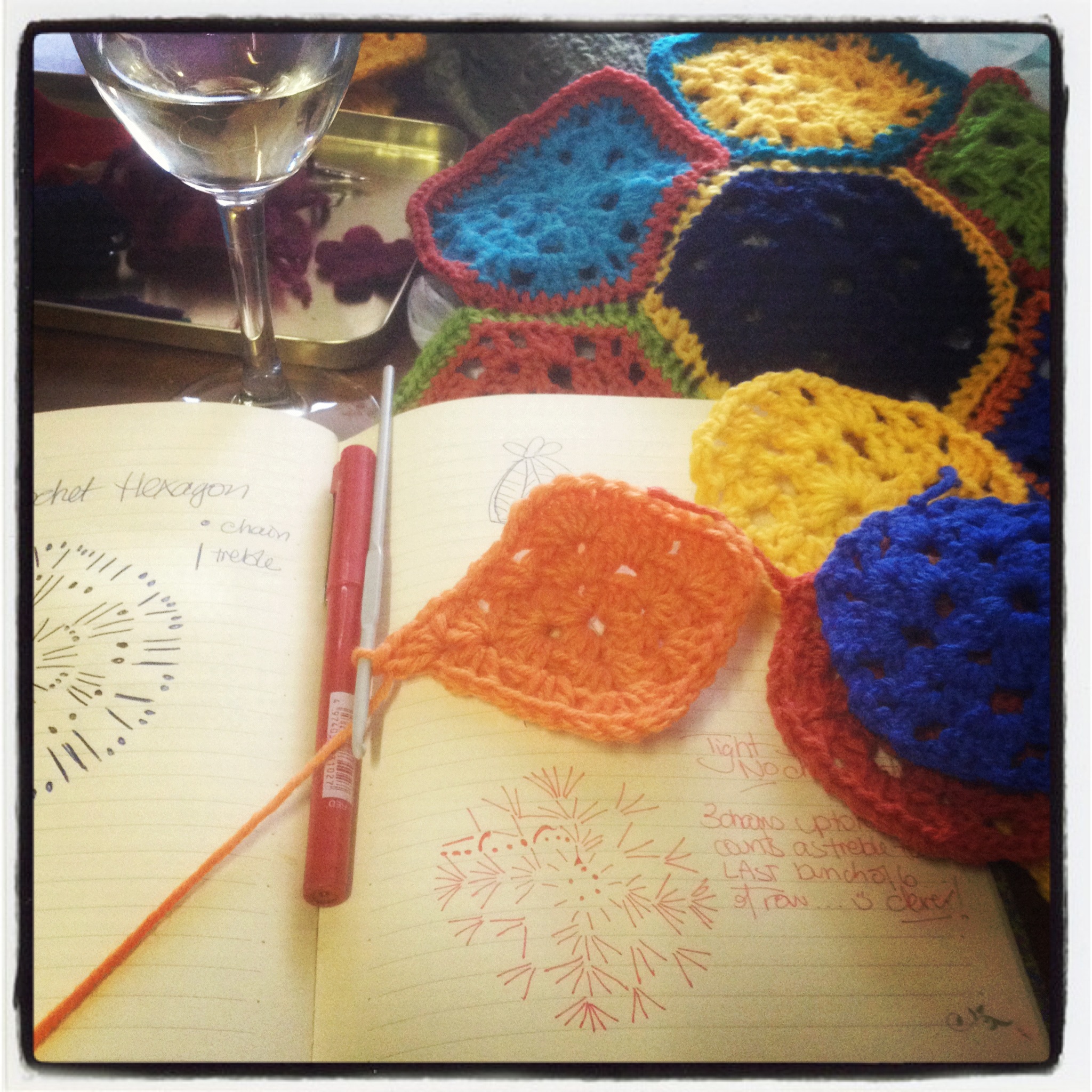 We take various half-finished craft projects and yet started ones. C. is the aficionado of all things textile and while A. and I are less skilled, we are no less enthusiastic. C. has hot machine washed and caused the felting of op-shop jumpers of various colours – a teapot cosy will be hand sewn and embroidered from these. A mish-mash of wools are brought – these will form many various crochet hexagons for the purpose of ? That’s not the point. It’s the doing. The luxury of hours and hours of doing without interruption from the word “Mum”.
