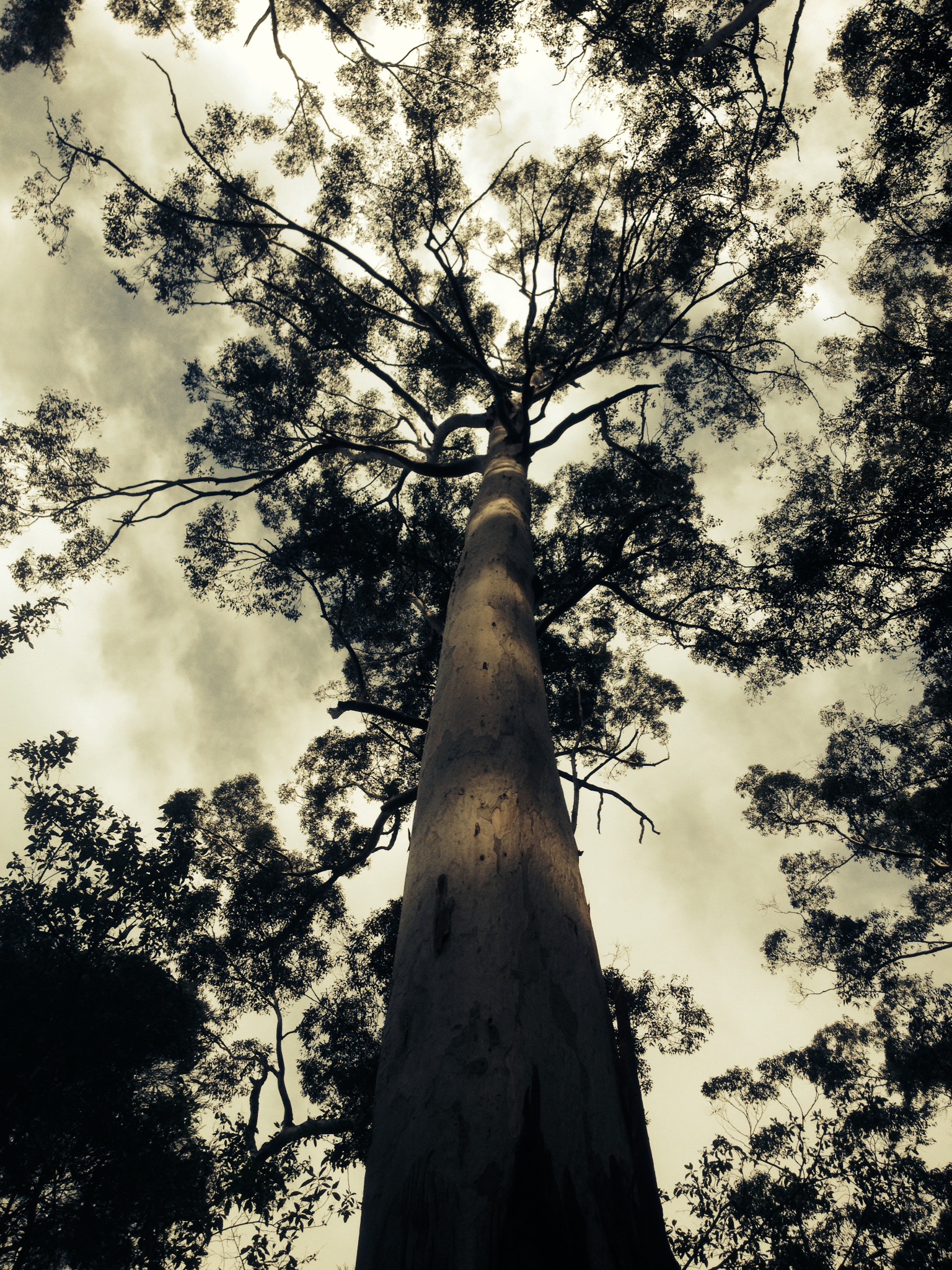 We are heading to the forest. Here the trees are tall and straight; good for the masts of tall ships and once used to paved the streets of London. But how much better to be standing here still, pushing skywards. To be beneath them is to be made midget in the most majestic of ways. This corner of bush hangs on in this damp and undulating part of the south-west. The ground is soggy. Water sits on its surface in large puddles and rushes in streams down the sides of roads. But, it is a timber town still. Rednecks have stickers on their utes, “Die Greenie scum.” Pastures are press studded with the black dots of Angus cattle. We see emus. We are constantly surprised by green. Green this fluorescent is a rarity in Western Australia.