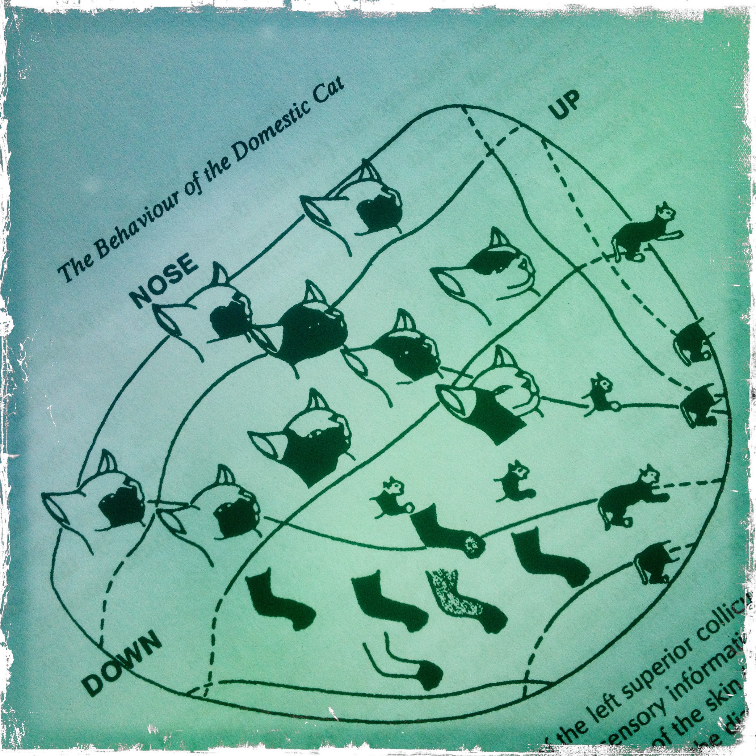What I learn; the cat is genetically more resistant than the dog to large variations in shape and size. Its manipulation has been less malleable. They have been domesticated for a shorter period, but even with more time, they seem unlikely to become as varied a species as Canis familiaris. It is as if they have kept a bit of themselves secret from us. Always a little bit wild. When the pupil of a cat is fully open she has nocturnal vision equal to that of a bat or a badger. To think that Chinese peasants used the size of a cat’s pupil to tell the time. I look at a diagram of the cat’s superior collicus in its mid brain – an area that processes and integrates sensory information. It is all about its face and fore paws. The fact that you’ve known since childhood that a cat uses her whiskers like eyes and that her paws are stealth weapons. Some things are easy to learn. You see them.