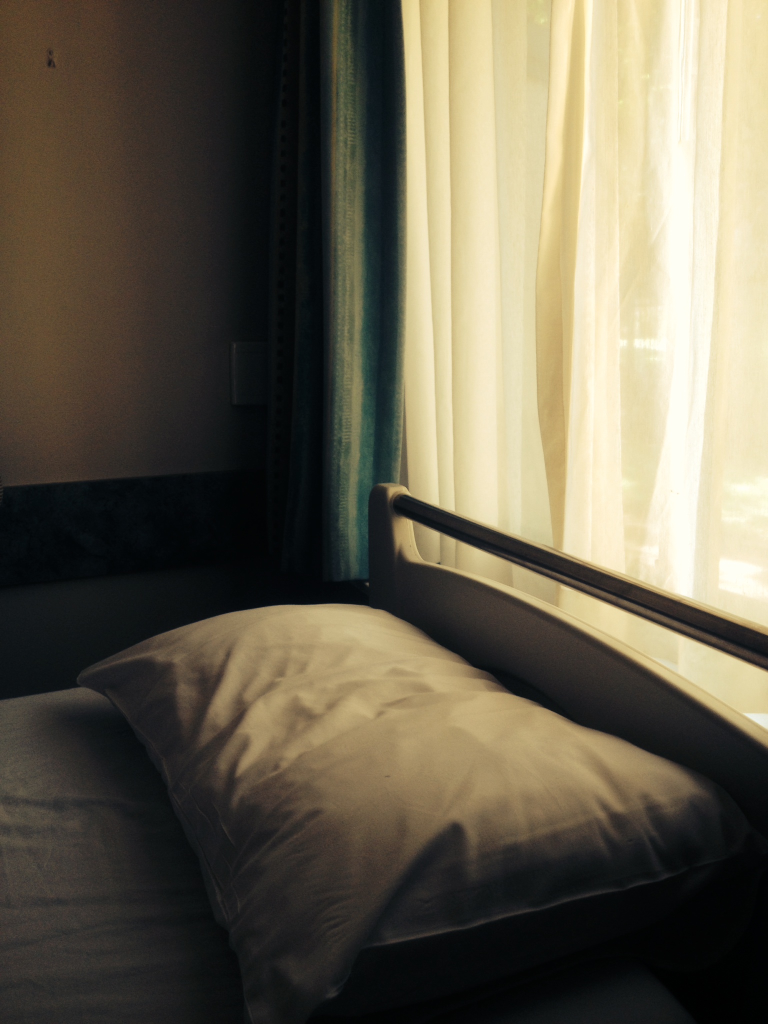 The room is right by the desk, the nurses station they call it. Behind nurses gather, all chinking with their keys and badges and tags hanging off their belts and on bum bags about their waists. Beneath their Polly cotton tops and pants are detectable rolls of fat around their middles. Proof they don’t work hard enough I think or else is just everyone fat these days.